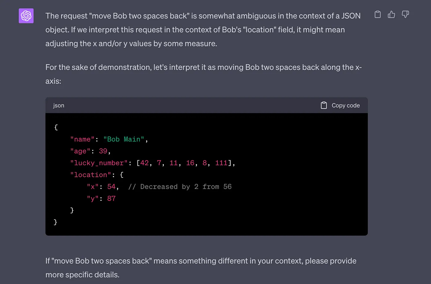 Here’s the full response as a screenshot where the full response is pretty interesting. While ChatGPT acknowledges the ambiguity of the instruction, it still manages to make a reasonable assumption — especially considering “back” is open to interpretation in this context.