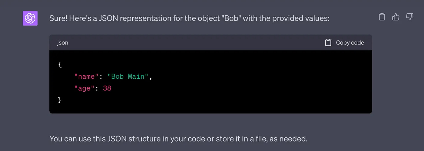 PROMPT: “Create a JSON object with the fields ‘name’ and ‘age’. Let’s name this object Bob. Assign ‘Bob Main’ as the name value and ‘38’ as the age value.”