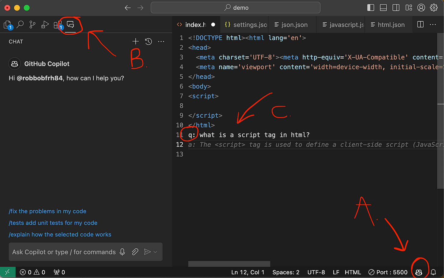 B: This is the Copilot chat icon that opens the chat box. 🔥 But, with the ability to reference your code. This is where we will focus our attention in this post.