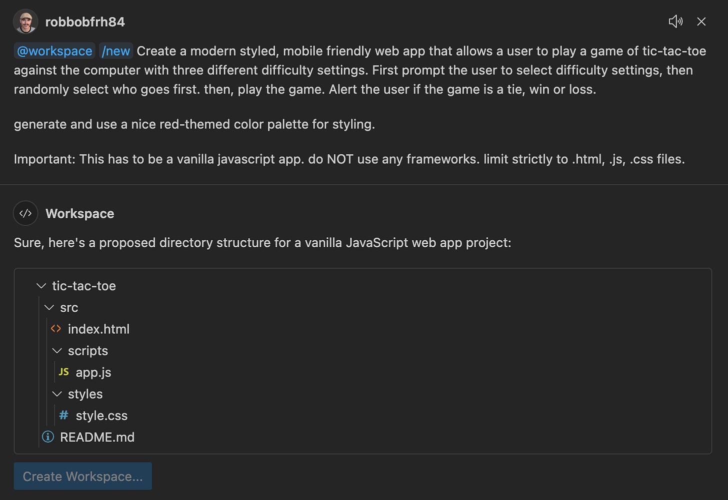 Here’s how that prompt/response looks. You then select “Create Workspace” and watch Copilot work.
