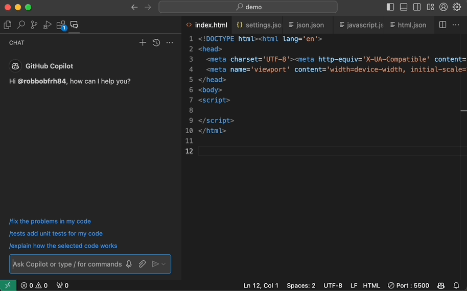 Naturally, you’ll want to make updates to your code that include changes to multiple files in your project’s codebase. This can be achieved by starting a chat with Copilot using the prompt prefix @workspace. So, let's test this by creating a main.css file with some code that we want Copilot to reference and change.